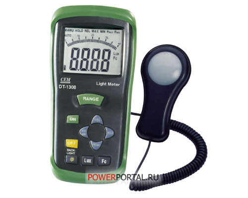 Измеритель освещенности DT-1308 Разрядность шкалы 4000 отсчетов Освещенность: 400/4000/40000/400000Lux: ±5.0% (<10000 Lux), ±10.0% (>10000 Lux) Удержание показаний MAX HOLD и DATA HOLD Режим регистрации пиковых значений PEAK HOLD Режим относительных измерений Автоматический выбор диапазона изменений Графическая шкала 41 сегмент Выбор функции измерения FC/Lux Скорость: 1.5 измерения в секунду Автоотключение Auto Power Off