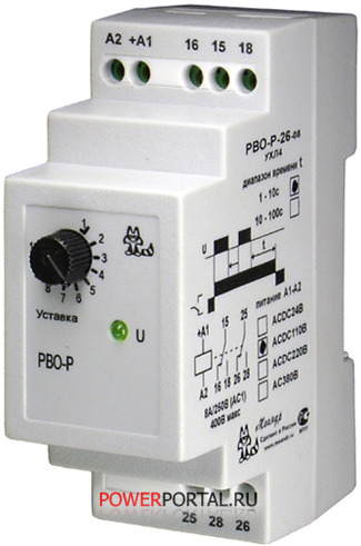 Описание / Назначение / Характеристики РВО-Р-26-08 Реле времени предназначено для формирования задержки на выключение встроенного электромагнитного реле через заданное время после снятия напряжения питания