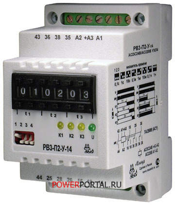Реле времени РВ3-П2-У-14 Трехцепное реле времени РВ3-П2 предназначено для выдачи команд в цепи схем управления через контакты встроенных электромагнитных реле после отработки предварительно установленных выдержек времени
