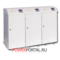 Стабилизаторы напряжения трехфазные выполняются на основе трех однофазных стабилизаторов напряжения. Стабилизаторы напряжения трехфазные мощностью 6-30 кВА реализованы в виде вертикальной стойки, на которой друг над другом навешиваются три однофазных стабилизатора напряжения. На стойке в верхней части смонтирован блок контроля и управления (БКУ), обеспечивающий согласованную работу стабилизаторов напряжения на трехфазную нагрузку.