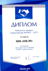 В конце прошлого года официальные представители компания ООО СКБ ЭП принимали участие во II ... В конце прошлого года официальные представители компания ООО "СКБ ЭП" принимали участие во II ежегодном Форуме по закупкам в электроэнергетике для производителей, поставщиков и подрядчиков ПАО "МОЭСК". Основное внимание в деловой программе Форума по многочисленным просьбам участников было уделено развитию взаимоотношений крупных заказчиков продукции и услуг и представителей малого и среднего бизнеса (МСП). Закупки у МСП являются одним из приоритетных направлений работы в области совершенствования торгово-закупочной деятельности ПАО "МОЭСК". Одним из значимых моментов Форума стало подведение итогов конкурса "Энергопартнер МОЭСК-2017", в котором компания ООО "СКБ ЭП" была награждена дипломом 3-ей степени в номинации "Поставщик года в категории "Малый и средний бизнес". Благодарим ПАО "МОЭСК" за доверие и надеемся, что в дальнейшем наше сотрудничество будет расширяться и крепнуть.