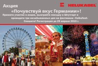 Акция «Почувствуй вкус Германии»! Примите участие в акции, выиграйте поездку в Штуттгарт и ... Акция «Почувствуй вкус Германии»! Примите участие в акции, выиграйте поездку в Штуттгарт и проведите три незабываемых дня на фестивале «Volksfest». Программа поездки включает в себя:посещение логистического центра Helukabel GmbH; знакомство с производством на заводе в Виндсбахе; обзорную экскурсию по городу; участие в фестивале «Volksfest». Акция проводится в период с 01 мая по 01 августа 2015 г. Приз получают трое участников, разместивших максимальный объем заказов в денежном исчислении в период проведения акции. Обязательное условие – регулярность размещения заказа (минимум 1 раз в месяц). Принимать участие в акции может любой желающий, победителям будут оформлены визы, перелет, проживание и питание с 07 по 09 октября 2015 г. Заполнить регистрационную форму можно по ссылке: http://www.helukabel.de/ru/ru/newsl etter_registration_6.html