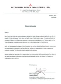 Землетрясение в Японии не повлияло на работу головного офиса Mitsubishi Heavy Industries, Ltd. в ... Землетрясение в Японии не повлияло на работу головного офиса Mitsubishi Heavy Industries, Ltd. в Токио Компания «Биоконд» - официальный дистрибутор систем кондиционирования Mitsubishi Heavy Industries, Ltd. (MHI), сообщает, что, несмотря на последствия разрушительного землетрясения в Японии, работа центрального офиса MHI в Токио продолжается в штатном режиме. Последние события не повлияли на работу головного завода MHI в Нагое, - природные катаклизмы практически его не затронули. Основным производственным мощностям Mitsubishi Heavy Industries, Ltd. в настоящий момент также ничего не угрожает, - они находятся вне зоны бедствия. По текущим вопросам компания «Биоконд» взаимодействует с европейским офисом MHI, штаб-квартира которого располагается в Лондоне. Поставки продукции российскому дистрибутору осуществляются с европейских складов в Роттердаме ...Далее»