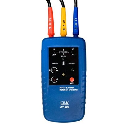 Индикатор порядка обмоток электродвигателя и чередования фаз CEM DT-902. Частотный диапазон - от 2 до 400 Гц; Степень защиты - CATIII 600В; Номинальное напряжение обмоток - от 1В до 400В.