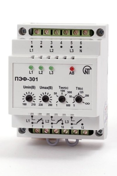 Предназначен для питания промышленной и бытовой однофазной нагрузки 220В/50Гц от трёхфазной четырёхпроводной сети 3Ч380+N с целью обеспечения бесперебойным питанием особенно ответственных потребителей и защиты их от недопустимых колебаний напряжения в сети. В зависимости от наличия и качества напряжения на основной фазе (установлен приоритет – линия L1), производит выбор наиболее «благоприятной» фазы и с высоким быстродействием производит переключение однофазной нагрузки на эту фазу. При восстановлении параметров напряжения на исходной фазе ПЭФ-301 переключит нагрузку на неё обратно. Если время возврата (Тв) в положении «∞», то возврат на приоритетную фазу не происходит.