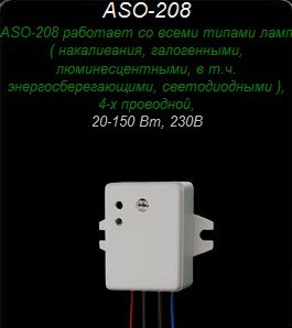 ASO-208 работает со всеми типами ламп ( накаливания, галогенными, люминесцентными, в т.ч. энергосберегающими, светодиодными ),4-х проводной, 20-150 Вт, 230В