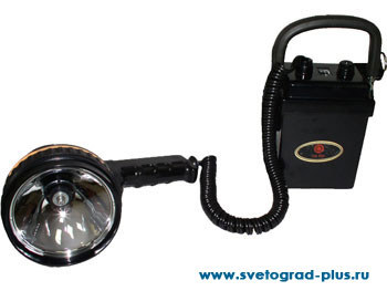 Подзарядка аккумуляторного блока производится от сетевого зарядного адаптера. Фонарь выдерживает падение с высоты 2 метров, защищен от ультрафиолетового излучения и проникновения вовнутрь воды. Переносится фонарь-фара на плечевом ремне.