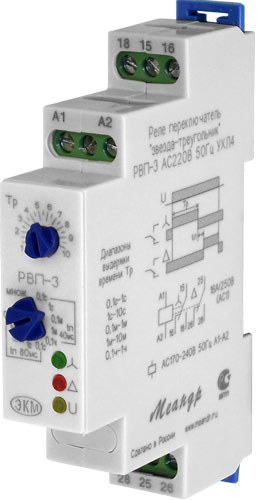Пусковое реле времени РВП-3 AC220В. Переключение «звезда-треугольник» («star-delta»). Используется для коммутации электрических цепей с предварительно установленными выдержками времени, отсчет выдержки по включению питания. Плавный запуск мощных трехфазных асинхронных электродвигателей, уменьшение пусковых токов при включении двигателей.
