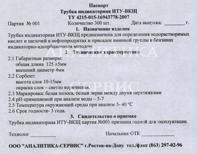 Описание для ИТУ-ВКЩ Индикаторная трубка для определения водорастворимых кислот и щелочей в светлых нефтепродуктах, моющих присадок и присадок аминной группы в автобензинах 0,01