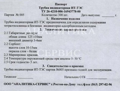 Трубка индикаторная ИТ-ТЭС предназначена для определения наличия свинца в авиационных и автомобильных бензинах.
