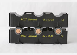 Крепежные хомуты TRI фирмы KOZ были специально спроектированы для обеспечения наилучшего способа монтажа трёх одножильных кабелей среднего и высокого напряжения в форме треугольника, и всегда могут поставляться в больших количествах со склада.