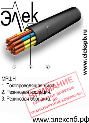 Токопроводящие жилы судовых кабелей МРШН скручивают из медной мягкой проволоки. Изолированные жилы многожильных кабелей МРШН скручивают концентрическими повивами в разные стороны. В каждом повиве имеется счетная пара, расцветка жил которой отличается друг от друга и от остальных жил.