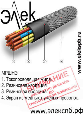 Токопроводящие жилы судовых кабелей МРШНЭ скручивают из медной мягкой проволоки. Изолированные жилы многожильных кабелей МРШНЭ скручивают концентрическими повивами в разные стороны. В каждом повиве имеется счетная пара, расцветка жил которой отличается друг от друга и от остальных жил.