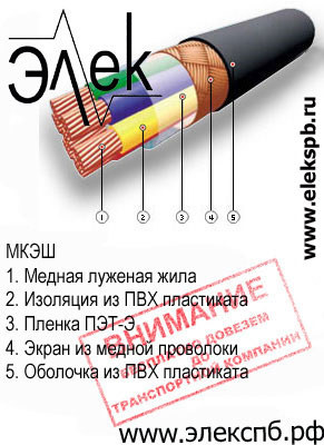 - МКШ — кабель с жилой из медных луженых проволок с изоляцией и оболочкой из ПВХ пластиката.