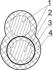Две параллельно уложенные алюминиевые жилы. Одна из них изолирована и покрыта экраном из алюминиевой фольги, контактирующей со вторым проводником. Вся конструкция в оболочке (марка АВПВ поливинилхлоридного пластиката).