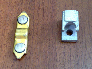 Контакт ПАЕ-400 подвижный (мостик) и неподвижный (башмак) изготовлены из электротехнической меди с металлокерамическими напайками на основе серебра (КМК-А10М) или из наноупроченных медных материалов (WPd-n-Cu).